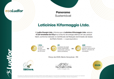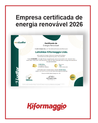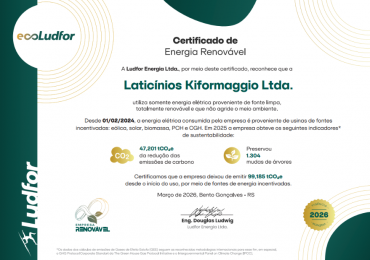 Comprometida com práticas sustentáveis e conscientes, a Laticínios Kiformaggio celebra mais um importante reconhecimento: a renovação do certificado que atesta a utilização de energia elétrica proveniente de fonte limpa, sem agressão ao meio ambiente. O certificado foi emitido pela Ludfor Energia, empresa especializada em gestão inteligente de energia, que confirmou a redução de emissões de gases de efeito estufa pela Kiformaggio. O selo é resultado de uma gestão eficiente do consumo de energia elétrica em seu parque fabril, que resultou na diminuição de 47,20 tCO2e. Segundo a Ludfor Energia, esse número representa um impacto ambiental significativo. A redução equivale a 1.304 mudas de árvores preservadas por 20 anos, ou 20 toneladas de papel/papelão que deixaram de ser enviadas a aterros sanitários, ou ainda 469 veículos leves movidos a gasolina percorrendo 500 km retirados de circulação. A conquista reforça o posicionamento da empresa em relação à responsabilidade ambiental e ao desenvolvimento sustentável no setor laticinista. “Seguimos trabalhando com consciência e responsabilidade, buscando sempre evoluir nossos processos e contribuir para um futuro mais sustentável”, destaca a direção da empresa. A iniciativa faz parte do programa ECO Ludfor, voltado à certificação de consumidores que utilizam energia de fontes renováveis ou adotam práticas que reduzem a emissão de gases poluentes. Mais do que uma renovação, esse reconhecimento reafirma o compromisso da Kiformaggio com o presente e o futuro, fortalecendo sua atuação como uma indústria responsável, eficiente e alinhada às necessidades ambientais.