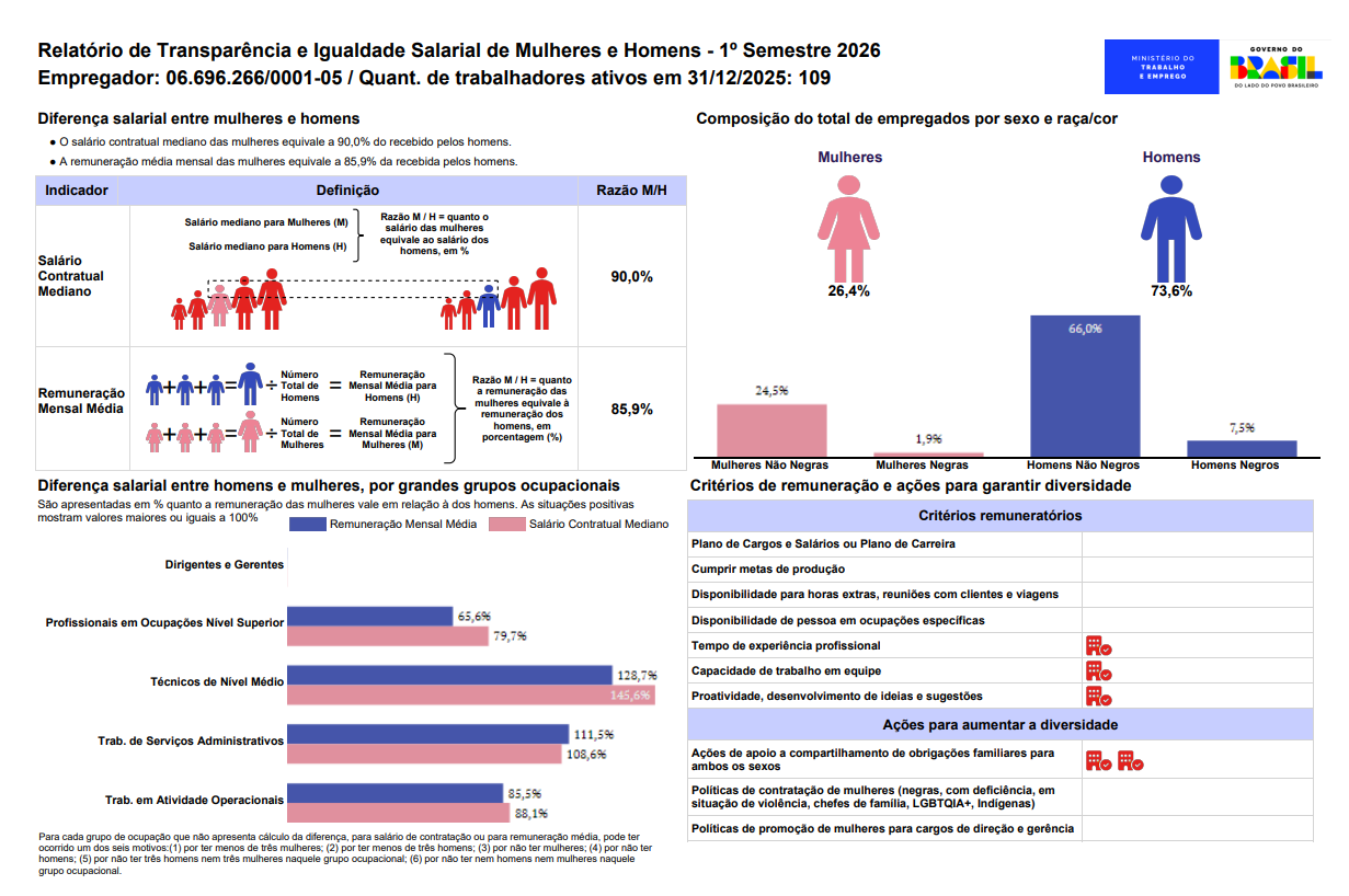 Este relatório, disponível no Portal Emprega Brasil, apresenta dados sobre a composição da força de trabalho por gênero, raça e etnia, além de informações salariais medianas e critérios remuneratórios adotados pela empresa. A iniciativa visa promover a igualdade salarial entre homens e mulheres, garantindo transparência nas políticas de remuneração e oportunidades de crescimento dentro da organização.