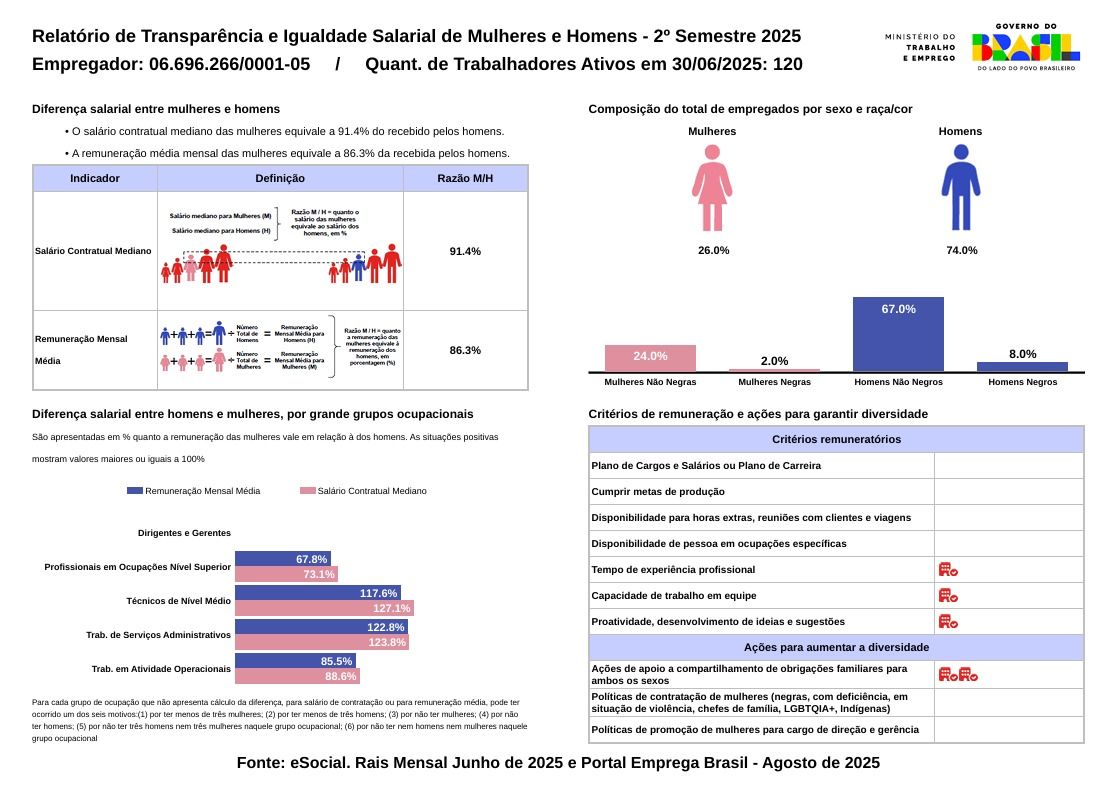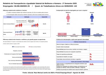 Em atendimento ao estabelecido pela Lei n° 14.611 de 03/07/2023, a Kiformaggio está divulgando aos colaboradores e ao público em geral, seu Relatório de Transparência e Igualdade Salarial de Mulheres e Homens, conforme exigido para empresas com 100 ou mais empregados. Este relatório, disponível no Portal Emprega Brasil, apresenta dados sobre a composição da força de trabalho por gênero, raça e etnia, além de informações salariais medianas e critérios remuneratórios adotados pela empresa. A iniciativa visa promover a igualdade salarial entre homens e mulheres, garantindo transparência nas políticas de remuneração e oportunidades de crescimento dentro da organização. A Kiformaggio reafirma seu compromisso com a transparência e a equidade, disponibilizando o relatório para que todos tenham acesso às informações sobre suas práticas salariais e políticas de promoção da diversidade e inclusão no ambiente de trabalho.